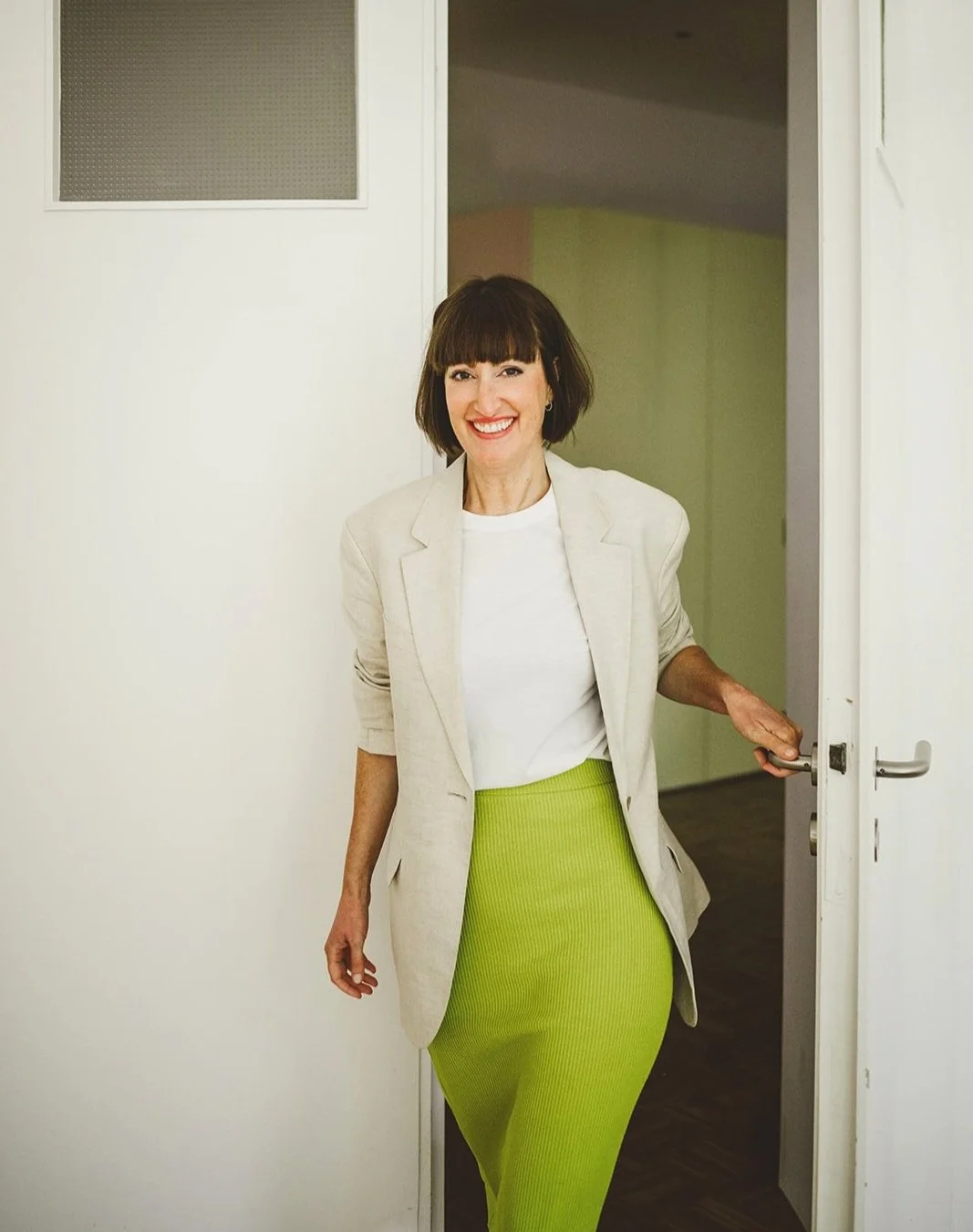 Frau in weißem Blazer und grüner Rock, die eine Tür öffnet und lächelt.